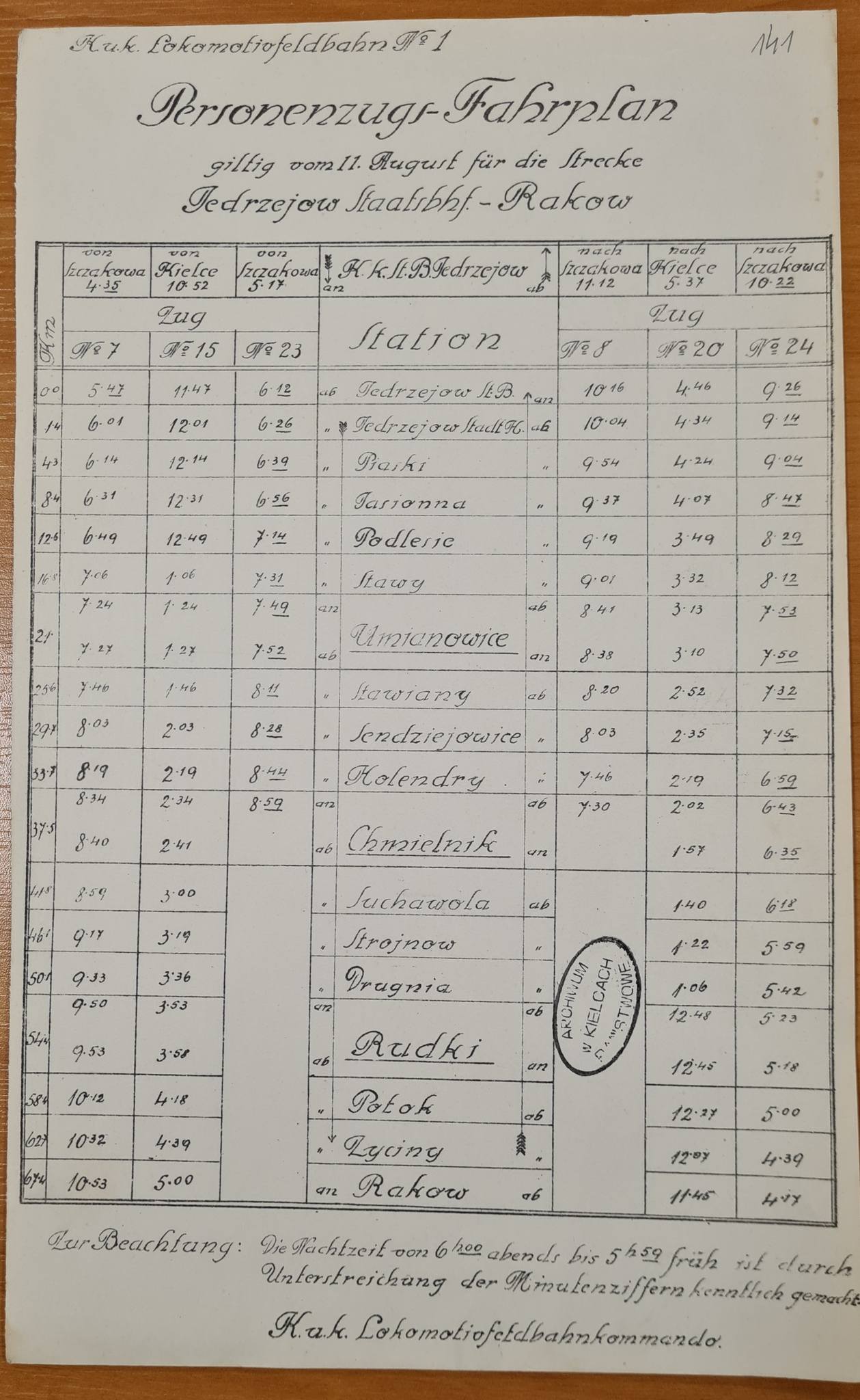 ważny od 1 czerwca 1917r dla kolejki Miechów-dworzec (Charsznica) -