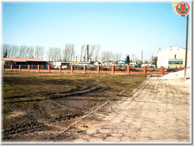 Opis: Płot w poprzek równi stacyjnej. Na pierwszym planie dawna "kolejkowa" nawierzchnia z trylinki