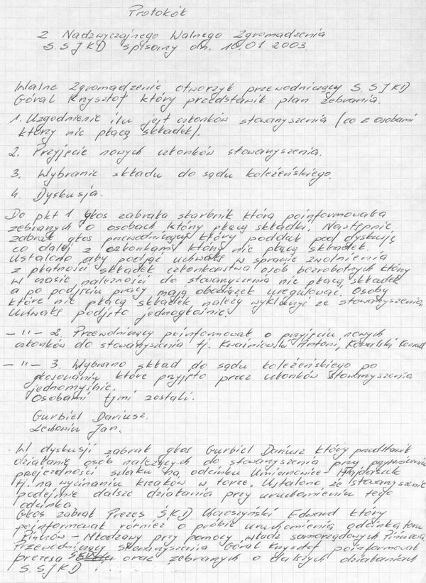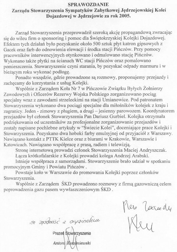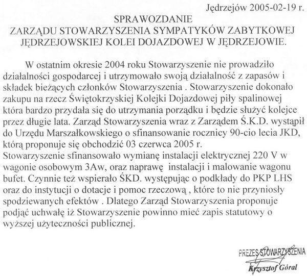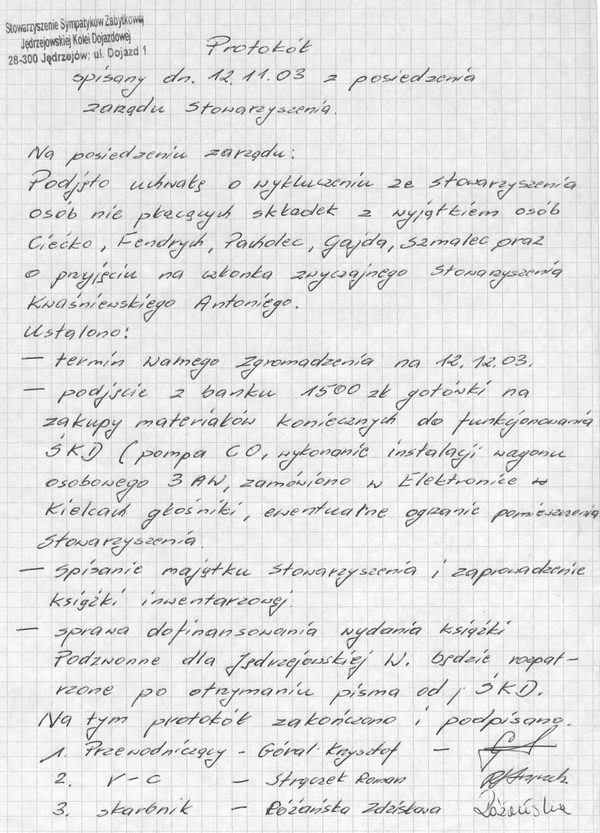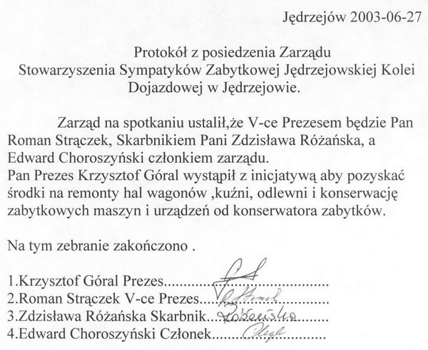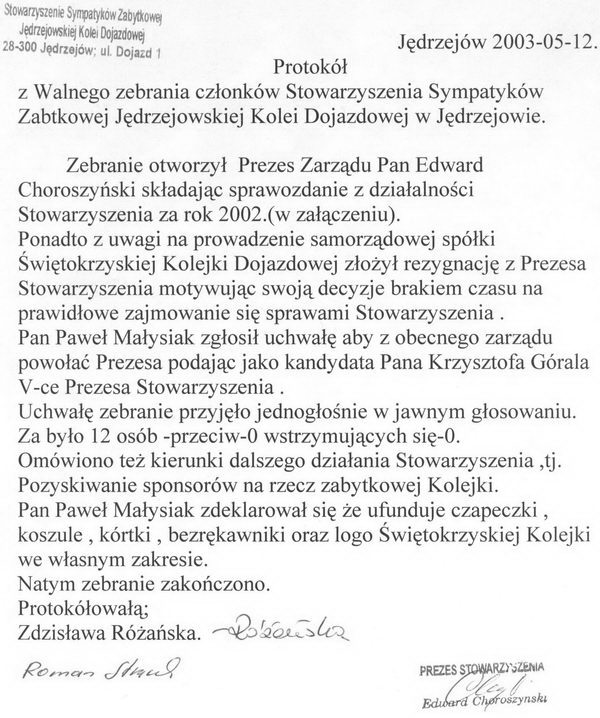 Protokoły z zebrań i sprawozdania Zarządu Stowarzyszenia Sympatyków Zabytkowej Jędrzejowskiej Kolei Dojazdowej
