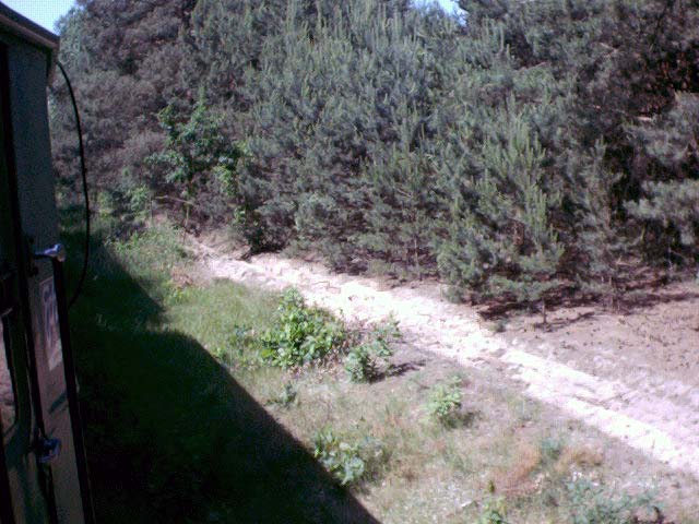 Z przodu, po prawej zachodnia część Garbu Pińczowskiego. Lekkim łukiem w lewo wyjeżdżamy na długą prostą wiodącą nas do sosnowego lasu, którego brzegiem przez moment jedziemy by po chwili weń wjechać. Tuż obok toru po lewej rośnie skupisko ciekawego krzewu Sarothamnus scoparius - żarnowiec miotlasty i jak sama nazwa wskazuje doskonale nadaje się on na miotły :) Ale to jeszcze nic w porównaniu z choćby gorejącym krzewem występującym na południowym zboczu garbu przed Pińczowem! |