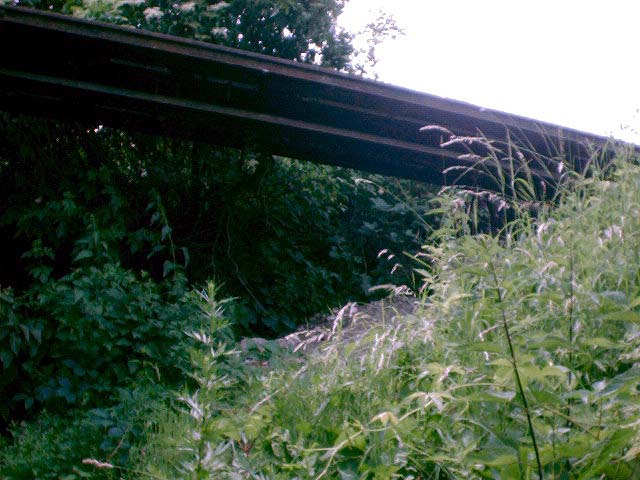 | 9. Jednak w trzcinach natknęliśmy się na nieistniejący przepust, nad którym szyny, a raczej szyna wisiała w powietrzu. Jak się bowiem okazało druga została skradziona na długości mniej więcej dwóch długich odcinków, brak też było podkładów, które zatopione znajdowały się w cieku wodnym. |